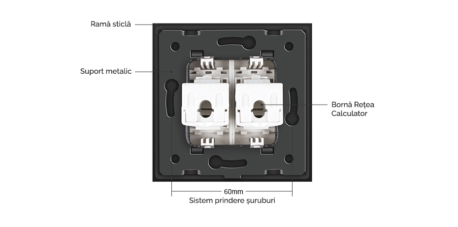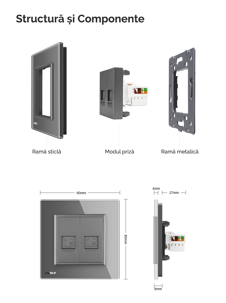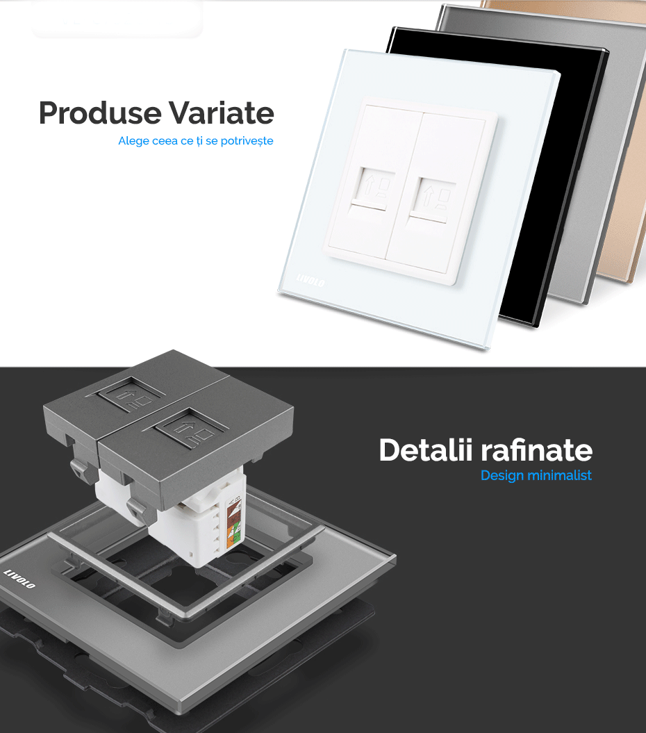 Priză dublă Rețea calculator RJ45 Livolo - priza dubla internet cu doua mufe tip RJ45, categorie de retea de comunicatie 6e, cu conexiune rapida UTP, ce permit transferul de date catre echipamentele de retea (PC-uri, switch-uri, hub-uri şi rutere), cu rama din sticla Crystal rezistenta la zgarieturi si uzura, cu rama interioara metalica, produs ignifug. Necesita o doza standard.