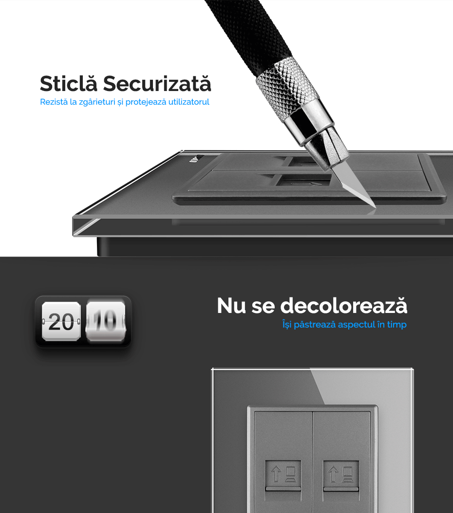 Livolo oferă o gamă variată de prize și întrerupătoare tactile cu rame și panouri din sticlă securizată, rezistentă la foc. Fabricate pe standard German, se potrivesc în dozele clasice pe care le aveți deja în perete și nu necesită modificare a instalației electrice existente.