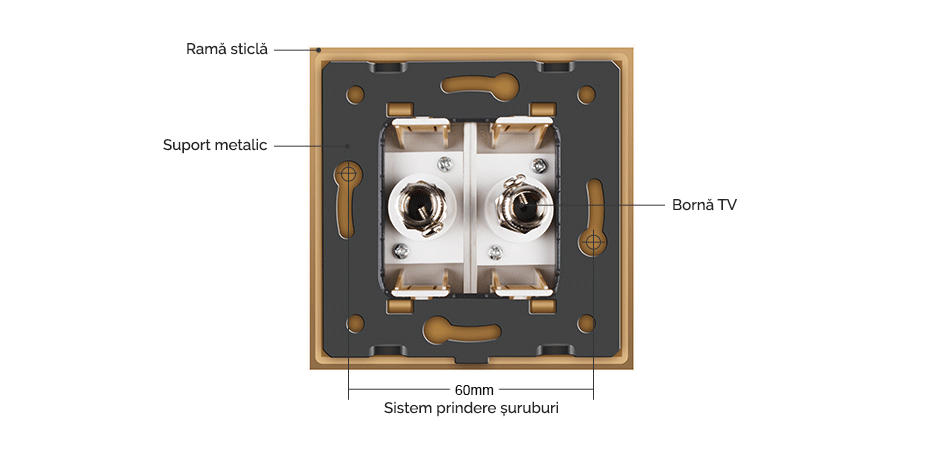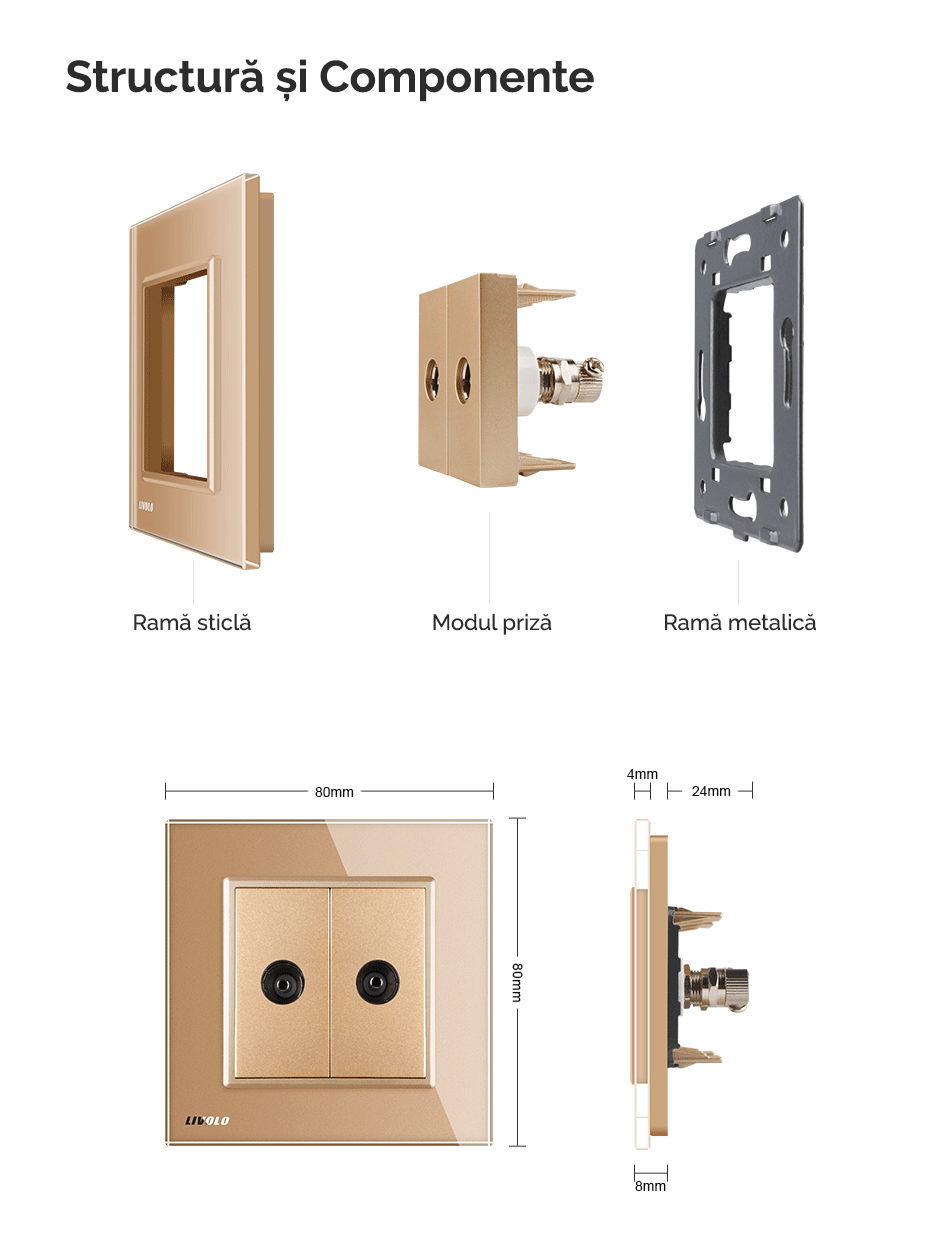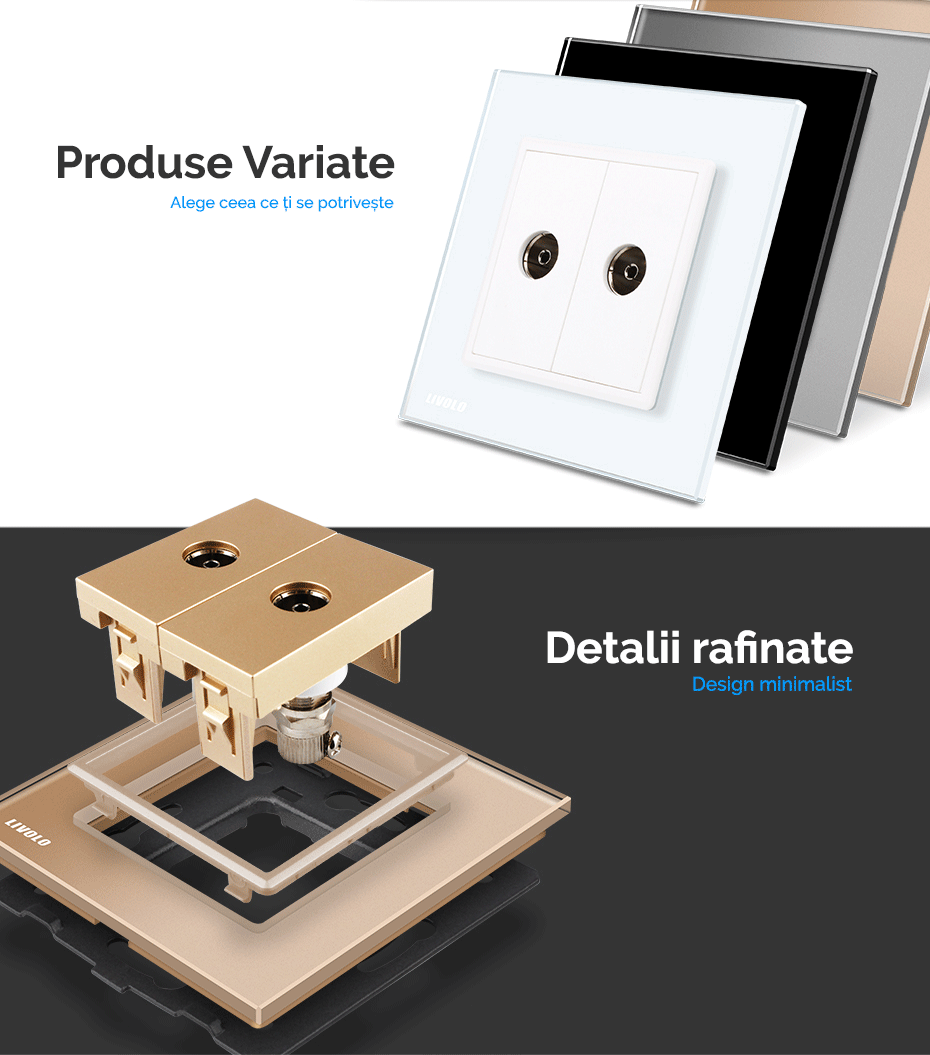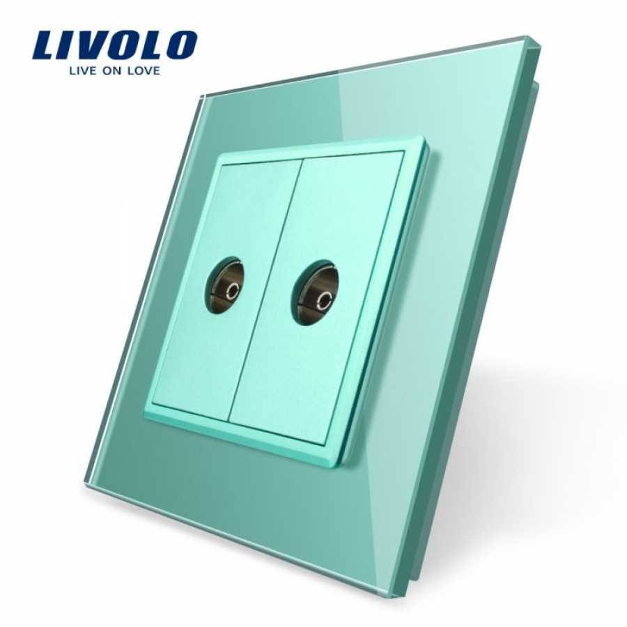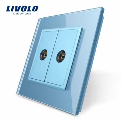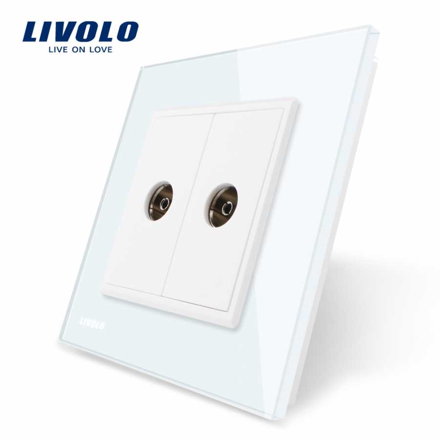 Priză dublă TV Livolo - priza dubla media cu doua mufe pentru TV, cu rama din sticla Crystal rezistenta la zgarieturi si uzura, cu rama interioara metalica, produs ignifug. Necesita o doza standard.