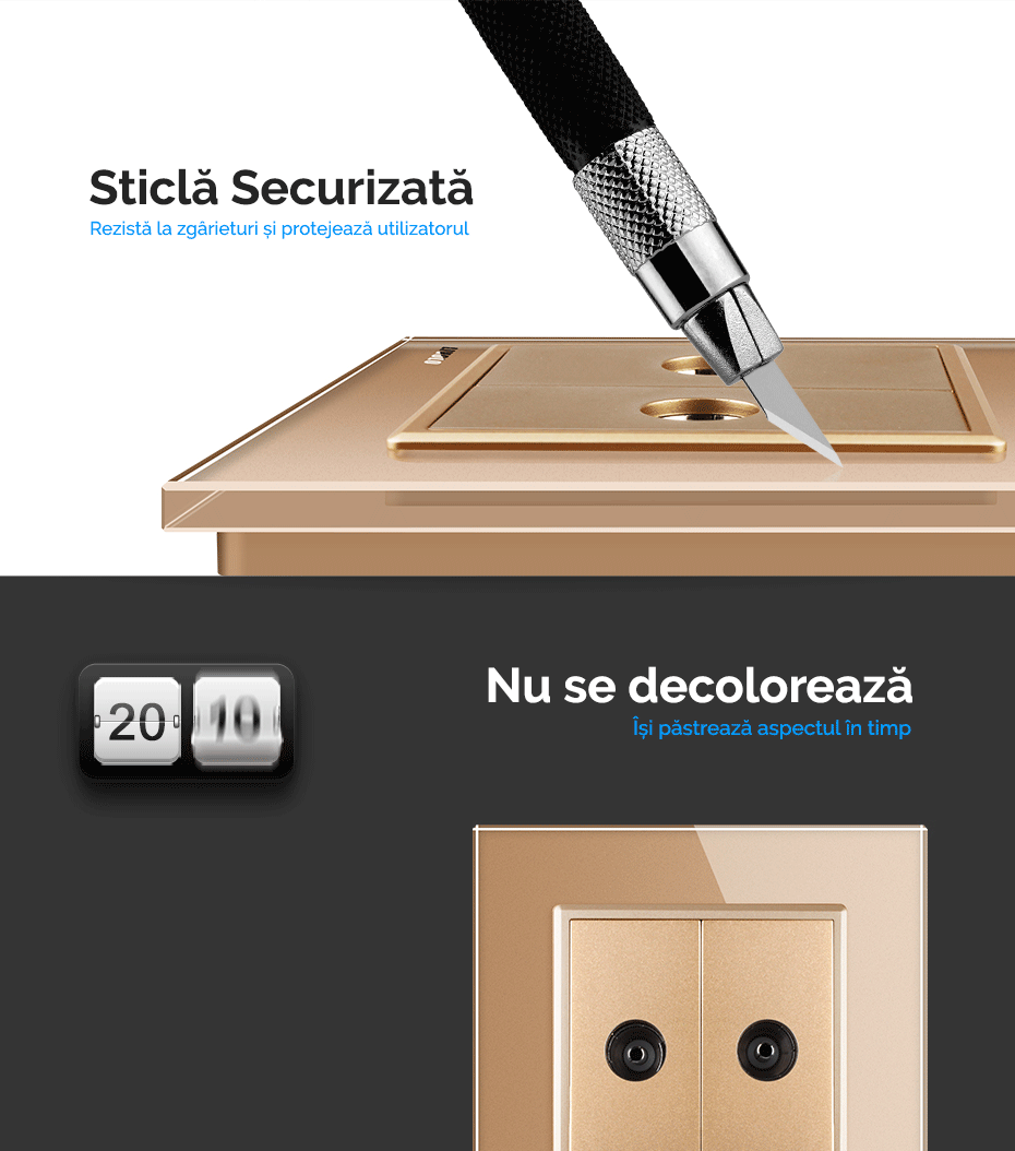 Livolo oferă o gamă variată de prize și întrerupătoare tactile cu rame și panouri din sticlă securizată, rezistentă la foc. Fabricate pe standard German, se potrivesc în dozele clasice pe care le aveți deja în perete și nu necesită modificare a instalației electrice existente.
