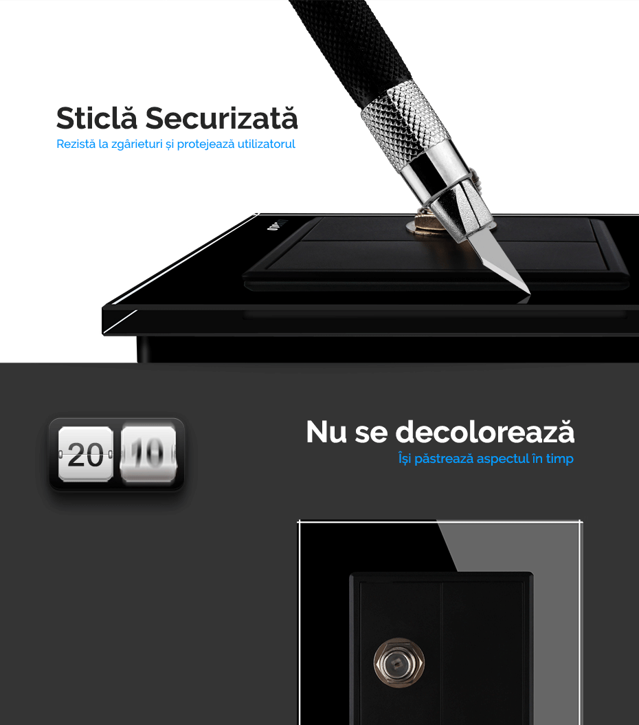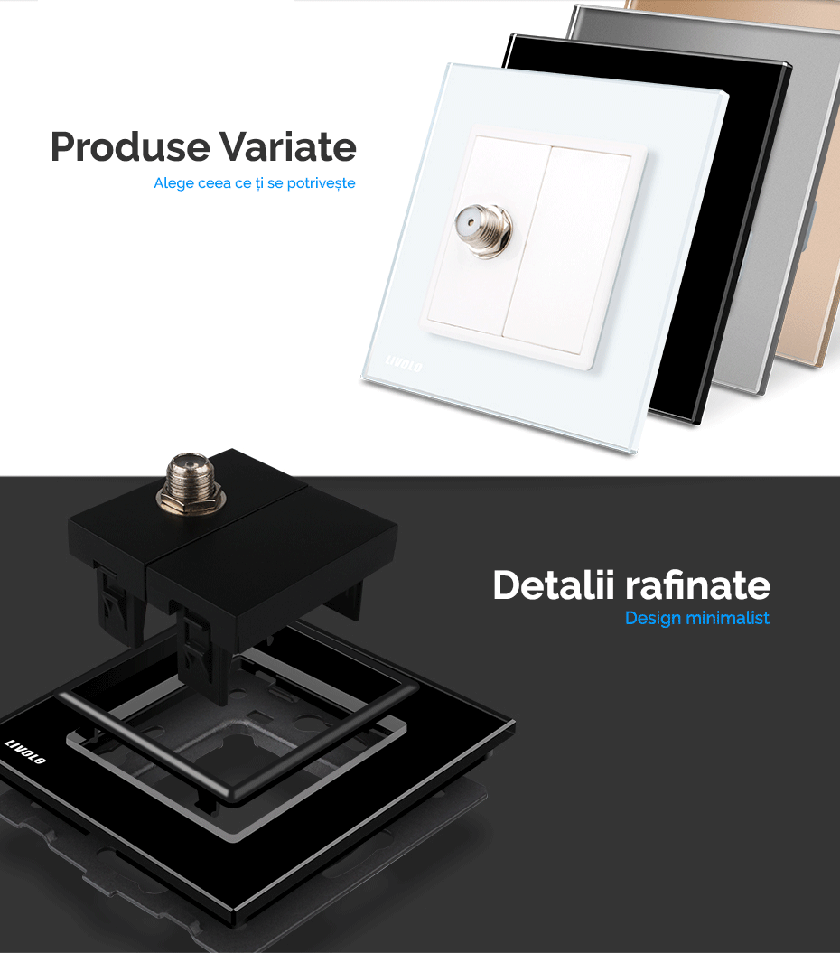 Livolo oferă o gamă variată de prize și întrerupătoare tactile cu rame și panouri din sticlă securizată, rezistentă la foc. Fabricate pe standard German, se potrivesc în dozele clasice pe care le aveți deja în perete și nu necesită modificare a instalației electrice existente.