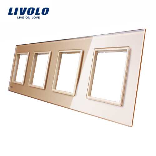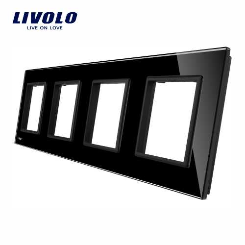 Ramă priză cvadruplă din sticlă LIVOLO - rama cvadrupla din sticla Crystal termorezistenta, rezistenta la zgarieturi, compatibila cu modulele de prize schuko sau media din gama Livolo: TV, telefon, audio, USB, internet, VGA. Dimensiune: 294 x 80 mm.