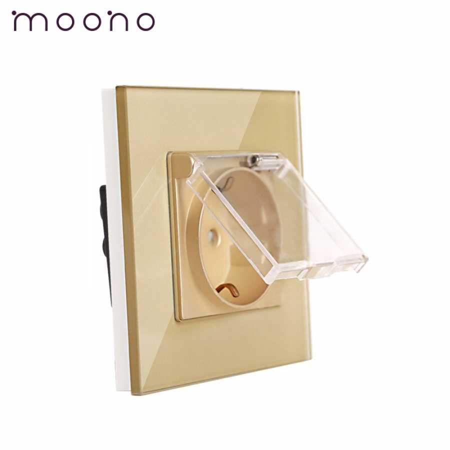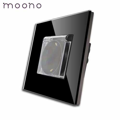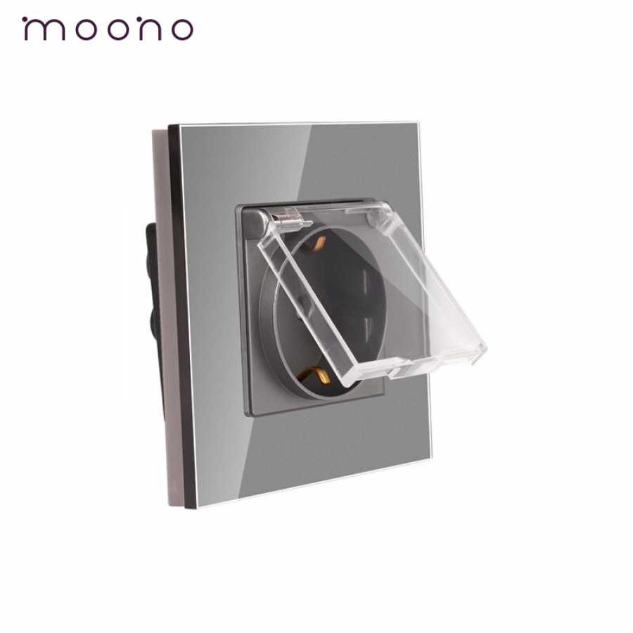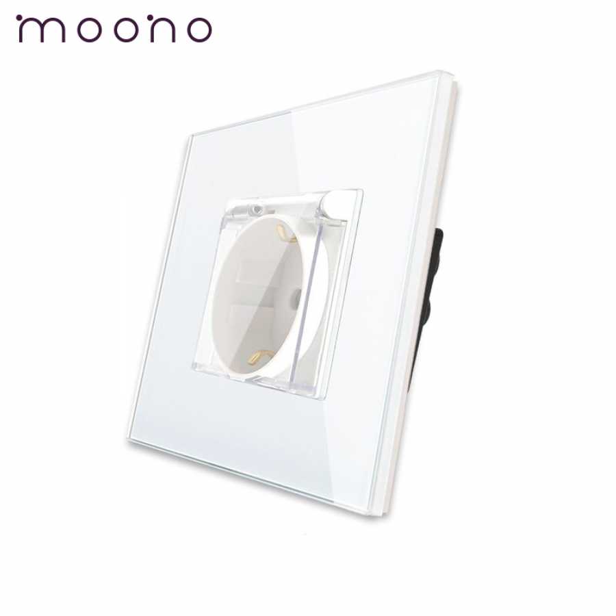 Priză simplă Schuko cu capac M1 moono - Priza simpla cu impamantare, model M1, cu rama din sticla rezistenta la zgarieturi si uzura. Are un design modern si materiale de calitate. Este compusa din suport metalic, priza Schuko si rama sticla securizata. Are si capac de protectie impotriva umezelii.