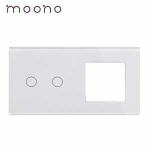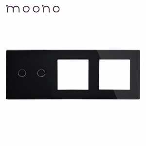 Panou întrerupător dublu+ramă din sticlă M1 moono - panou din sticla moono, model M1, pentru un intrerupator dublu cu touch si un modul priza la alegere, pot fi montate prize simple schuko sau media (TV, internet, audio telefon). Este fabricat din materiale premium, rezistente la zgarieturi si umiditate, mereu va arata ca nou. Panou frontal din sticla pentru un modul priza si un intrerupator dublu cu touch (atingere) on/off, cu led albastru deschis – cand intr..