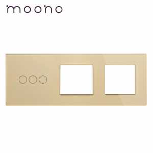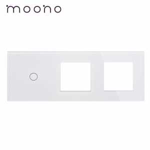 Panou întrerupător triplu+ramă dublă din sticlă M1 moono - panou din sticla moono, model M1, pentru un intrerupator triplu cu touch si doua module de priza la alegere, pot fi montate prize simple schuko sau media (TV, internet, audio telefon). Este fabricat din materiale premium, rezistente la zgarieturi si umiditate, mereu va arata ca nou. Panou frontal din sticla pentru doua module priza si un intrerupator triplu cu touch (atingere) on/off, cu led albastru deschis..