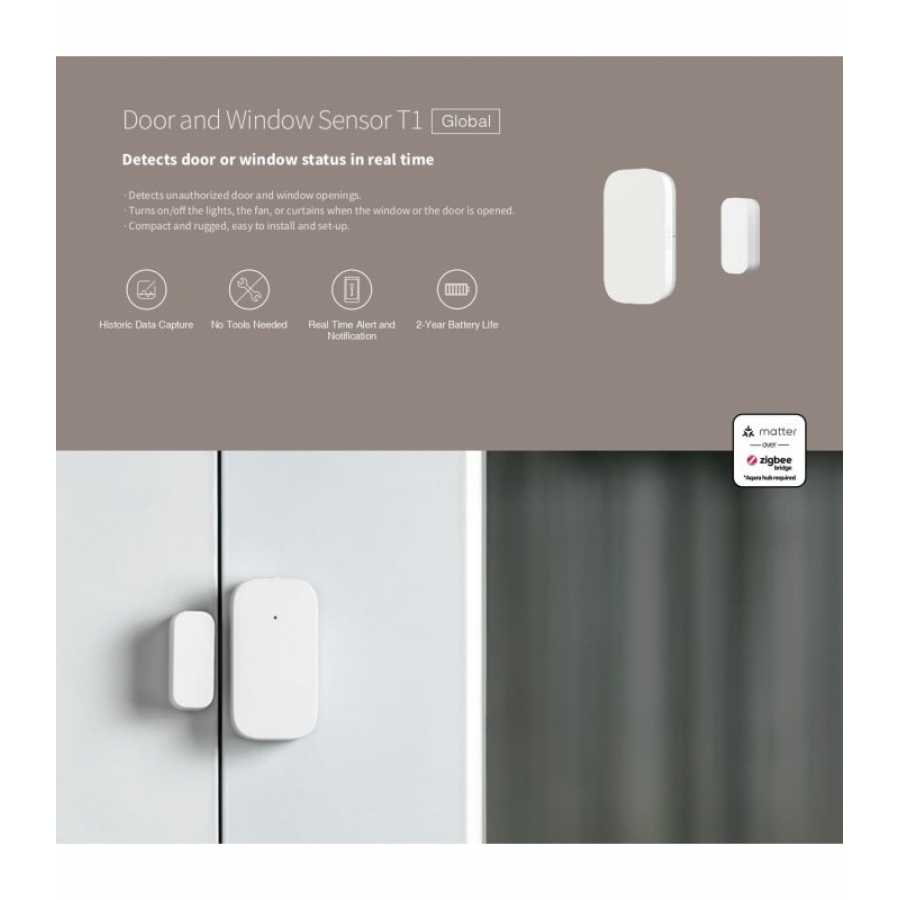 - Tehnologie avansată: Aqara Door and Window Sensor T1 detectează starea actuală a ușilor sau ferestrelor prin intermediul distanței dintre senzor și magnet. Senzorul este, de asemenea, eficient din punct de vedere energetic, iar o baterie poate dura peste 2 ani în condiții normale de utilizare.