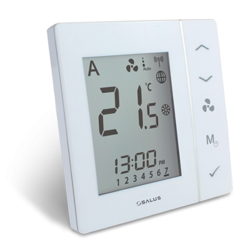 Termostatul SALUS FC600 este un echipament destinat controlului ventiloconvectoarelor atât a sistemelor în 2 țevi cât și a sistemelor în 4 țevi. Pentru a fi conectat la internet (Online Mode), acest produs necesită folosirea dispozitivului SALUS UGE600 și a aplicației SALUS Smart Home.